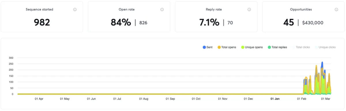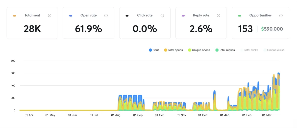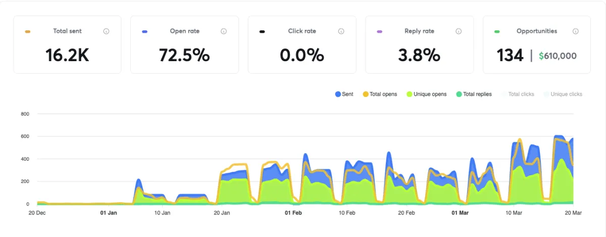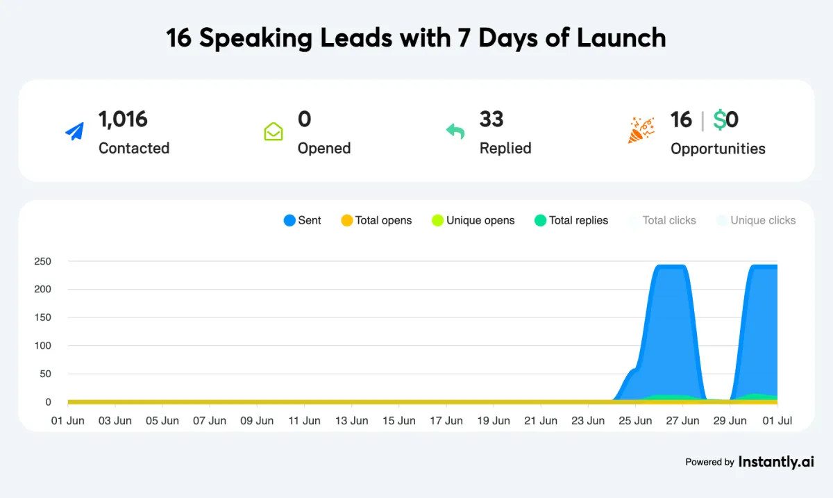 In just a few short weeks, Jacob’s campaign produced 35 speaking opportunities and over $37,000 in pipeline. With a 7.9% reply rate across nearly 1,700 emails, his message is landing, and now, his business is scaling.