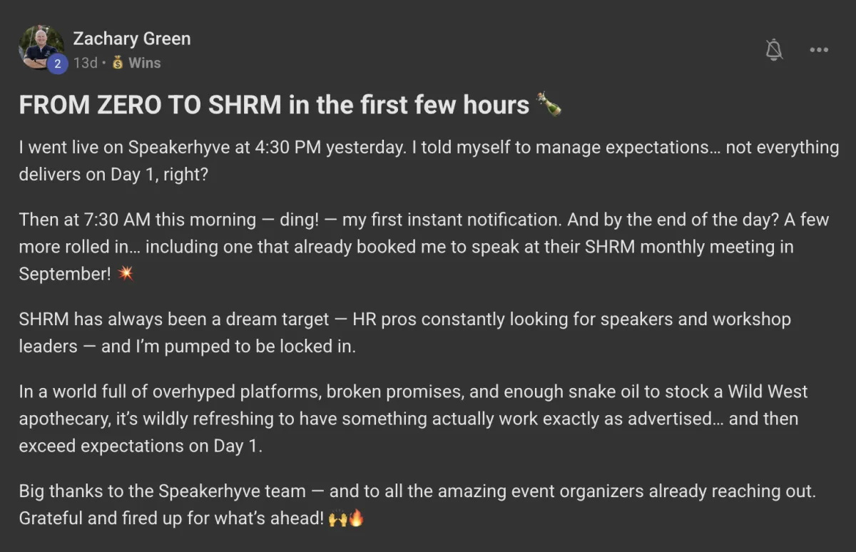 If someone doesn’t use their own system to get results… run. At Speakhyve, we are also the case study. The same outreach system, CRM workflows, and lead generation engines we install for speakers? That’s exactly how most of you found us.