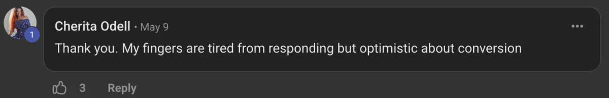 The Result She generated 72 qualified leads in just 4 weeks. In fact, the only challenge became keeping up with the volume..her inbox was overflowing with interest. As she joked, her fingers were sore from replying to leads 😅.